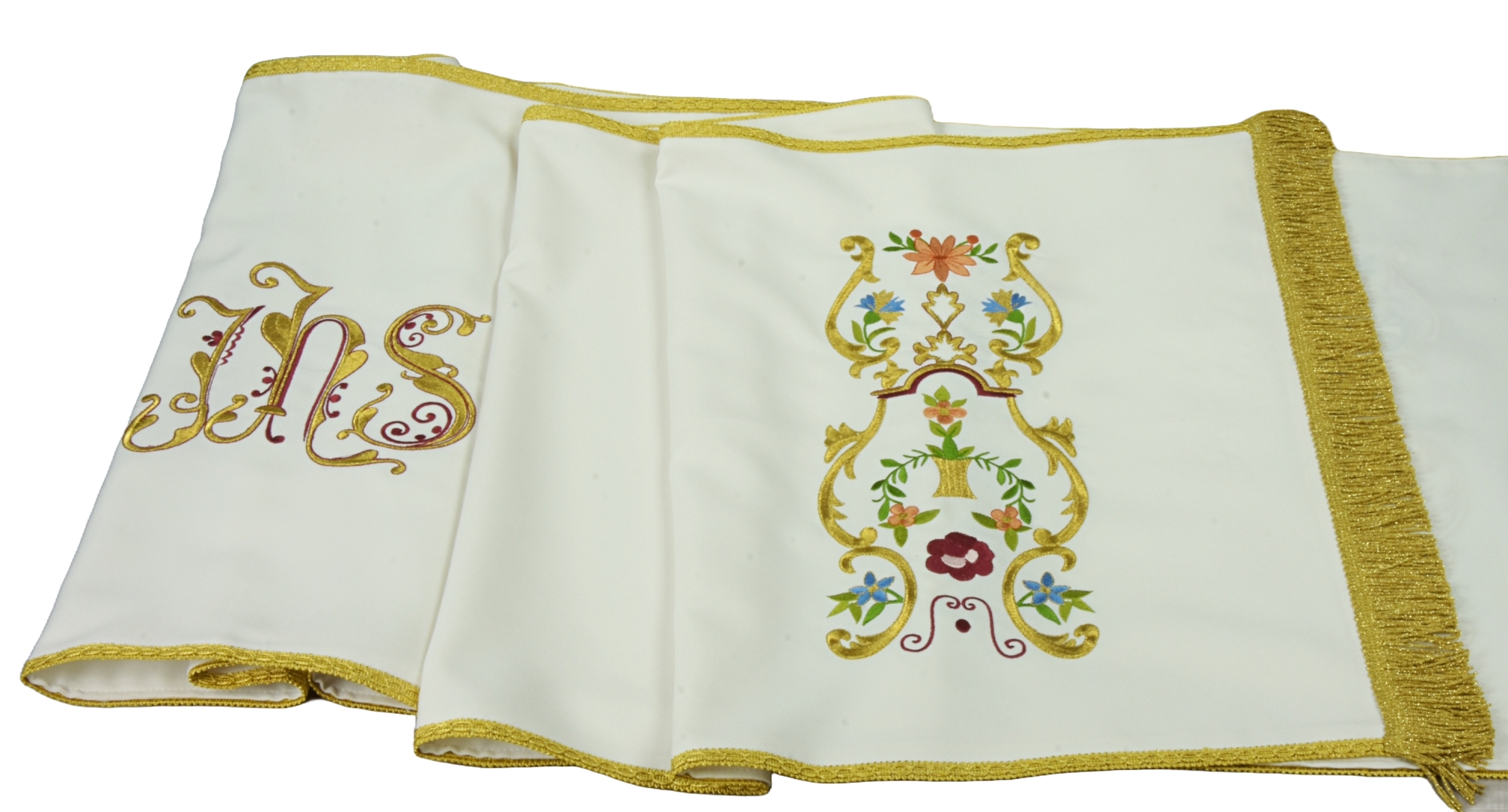 Un ricco ricamo di fiori, ornato barocco, e simbolo IHS centrale.