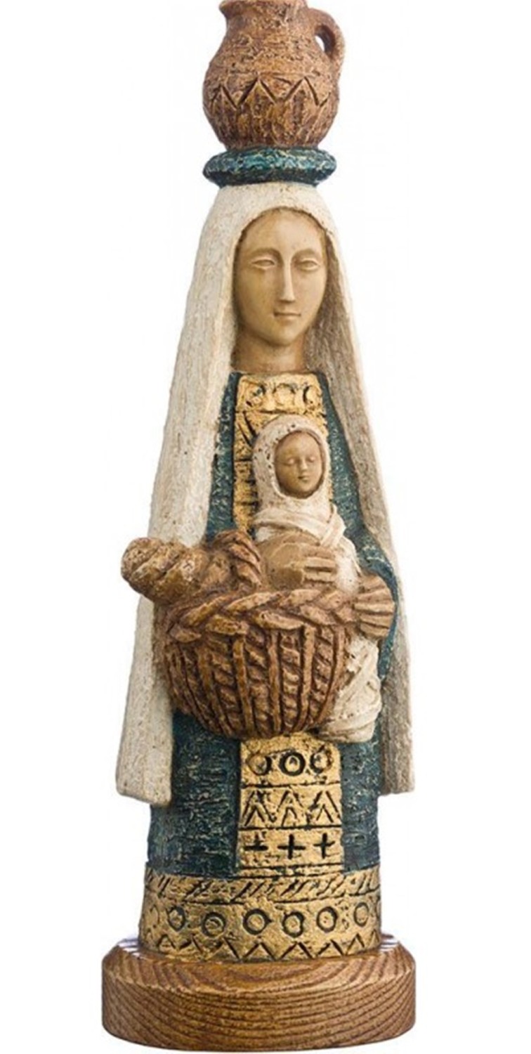 elegante statua ella Vergine Maria in versione “casalinga” rappresentata in una scena quotidiana di vita.